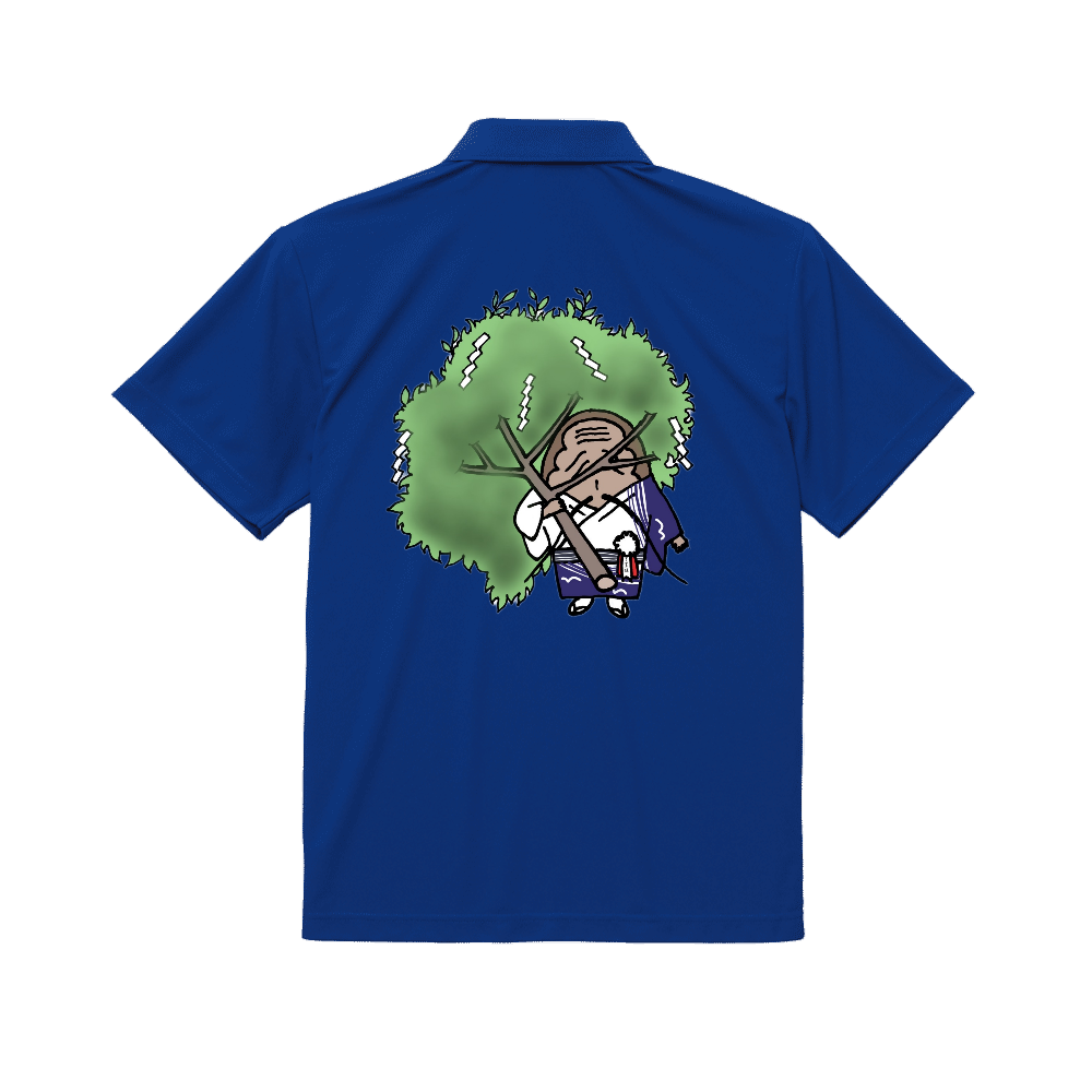 ポリエステル鹿の子を使用した、さっぱりとしたドライタッチの生地のポロシャツです。 表地は上品な光沢となめらかな風合いで肌ざわりも良く、汗冷えしにくいので快適なウェアで最高のパフォーマンスを実現しております。 ホワイトの生地には透け感を軽減させるため特殊な糸を使用。 そして、シワが付きにくく、乾きやすい、繰り返し洗っても色落ちしにくいイージーケアが何よりも魅力です。 前面には、扇の浴衣を着た黒羽織の「せなじぃ」、背面にはカモメの浴衣を着た榊持ちの「せなじぃ」がプリントされています。